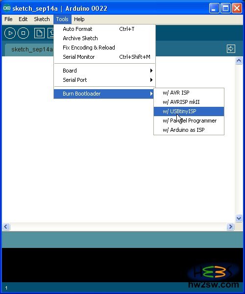 - Tools -> Burn Bootloader -> w/ USBtinyISP (third item).