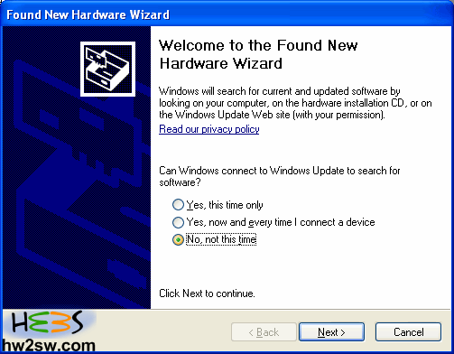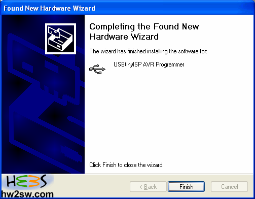 - automatic (xp): connect USBtinyISP board to pc via usb; system will notify you about new hardware found, opening a wizard window which to choose software installation from. Select "No, not this time" and click "Next".