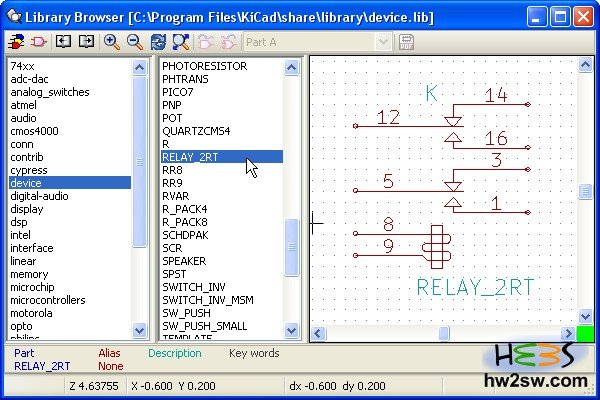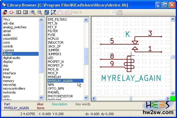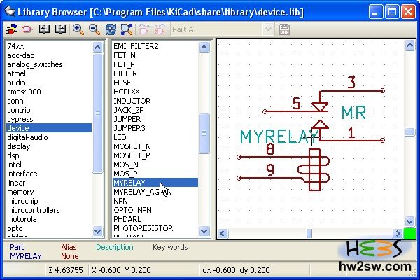 Or better, return to EESchema and click on "Library browser". A browsing window opens: select device and then check for MyRelay and/or MyRelay_again.